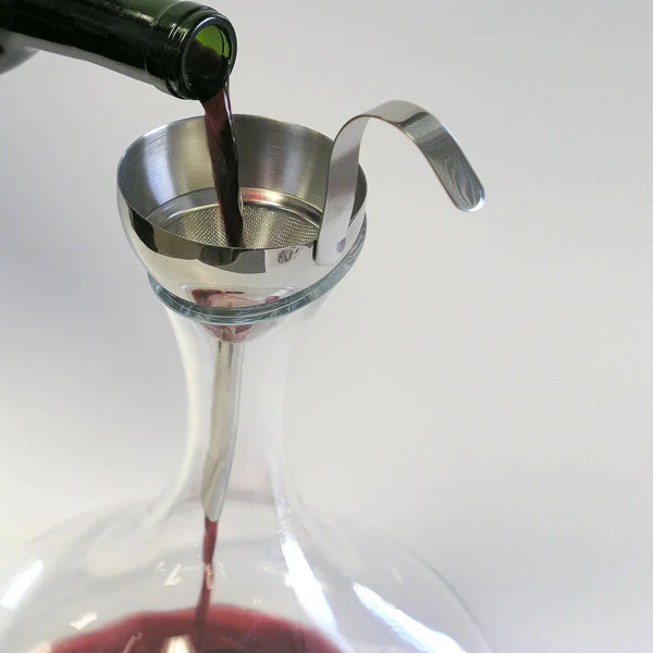 The most dependable way is to do your own filtering before serving. There are several inexpensive devices on the market for doing this. The best one is a combination filter/aerator funnel. You simply hold this funnel above your decanter (or any other suitable container) and pour the wine through. It has a micro-fine filter built-in that traps all those undesirable particles while allowing all the wine to pass through. As the wine exits the funnel, it gets aerated (exposed to air) which will usually help a young red wine. You’ll then find all those undesirable particles trapped in the bottom of the funnel. Not lurking in your wine glass.